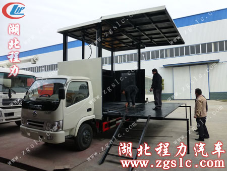 該東風(fēng)小霸王舞臺車配備朝陽柴油環(huán)保發(fā)動機(jī),汽剎,帶方向助力。舞臺結(jié)構(gòu)采用全液壓操作裝制,4條液壓缸升起頂板,升降平穩(wěn)。舞臺收展自如,舞臺布置更加高效、便捷。車廂頂部使用防雨防漏技術(shù)處理,另一側(cè)板與底盤連接固定,固定一側(cè)的頂棚預(yù)留安裝LED屏框架,配備外接電源接口、配電箱、爬梯。 湖北程力專用汽車有限公司銷售部 |